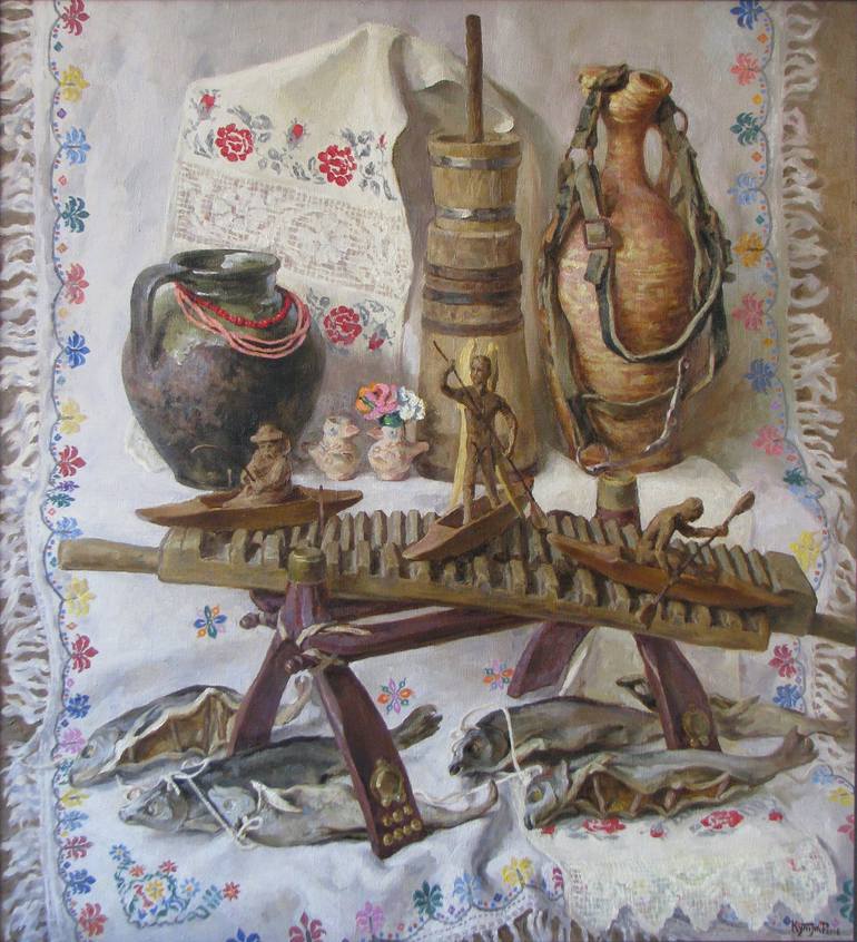 In the work “Ferryman. The river of love and oblivion”, both Christian and more ancient symbols are used. The still life is built on a white cross-stitched tablecloth and a wedding towel. A pot-bellied jug studded with beads indicates a woman who is faced with a choice between suitors. One of them d...