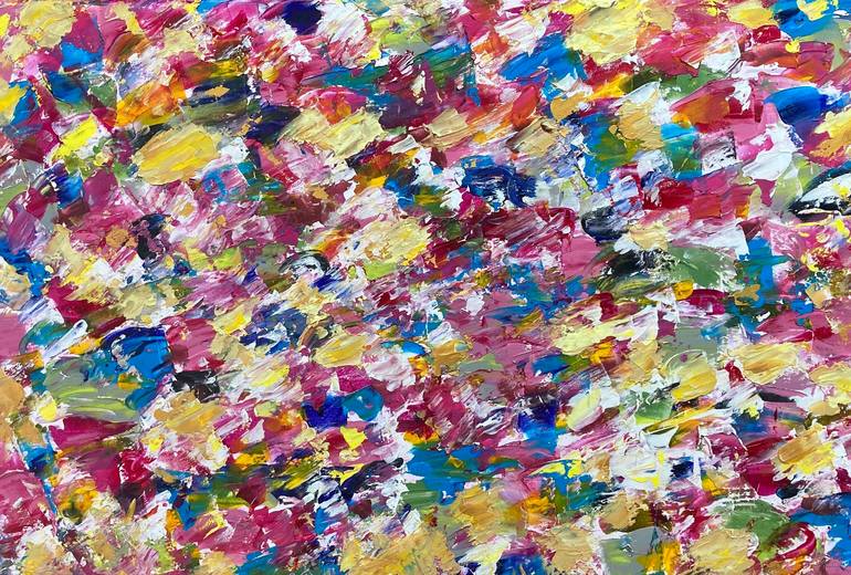 The inspiration comes from the happy state of being. One choses to be happy as opposed to living as a victim. This is the result of years of putting in practice that theory. Hopefully the onlooker will have feelings of inner joy. Acrylic, pasts and painter's knife are used here.