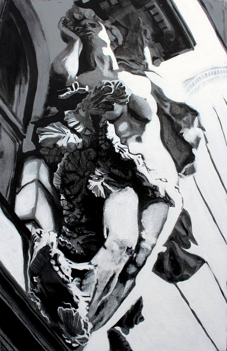 When painting, headdresses and crowns deify Kate Kelton’s subjects. She uplifts the Unsung Sheroes & Heroes, Patriarchy Smashers, Warrior Survivors, Silence Breakers, Philosophers, Truth-Tellers, Whistle Blowers and Thought Giants of all stripes. She paints her portraits cloaked in the garb of statues Ladislav Šaloun sculpted onto the train station that her great-grandfather, Josef Fanta, designed for Prague in 1901 - 1909. Apotheosis through a reclaimed, reapplied Art Nouveau. Sampling her own lineage, she transforms a historical body of work, itself a thing of lasting beauty; exchanging granite for graphite, plaster for paint. In Photoshop, she first combines the desaturated faces she's found, sourced or shot of her chosen subjects, with the black and white photos from her family and friends, of the statues in situ. Then she uses graphite, inks and acrylic paints and glazes to create the works on panel or canvas, literally uplifting and elevating her battle-weary subjects to the highest reach of architectural strata. 'Ancient and distant godlike beings, surveying a dying empire, trade places with the fresh blood of her subjects. The work presents a tactility against the digitized space, and represents a taking, an acquisition of power back from the tastemakers. Here, the mantle of the artist is above brand influencer, above internet commentator, above mere marketability. In their gaze is a warning, “Art is immortal. Come for me, why don’t you?”' ~ Micah Chaim Thomas "Kate's recent work is a matter of expansion through contrast - she is as ephemeral as her subjects are concrete architecture; she is structural when her subjects should slip through your fingers like too-fine sand. Taken as a whole, the works in her magnificent series Sentry are incredibly intelligent, but when looked at individually, you come to understand that these are statements of life beyond themselves. The series take embellishments of a Prague train station designed by her great-grandfather, Josef Fanta, and combines these with portraits of women who have stood against the sexual harassment and assault rampant in Hollywood. These women, like Kate herself, have suffered in the era where powerful men, every bit as immovable as the train station, wielded their power without check. The portraits emblazoned on architectural elements, they are marked against the edifice, every bit as permanent, and perhaps even more defining.