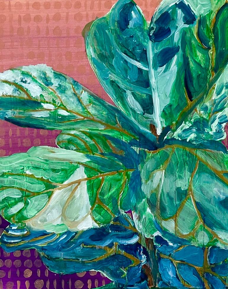 A close up exploration of a fiddle leaf fig with subtle binary code running in the background. In bold, vibrant color, nature and technology meld and play together.