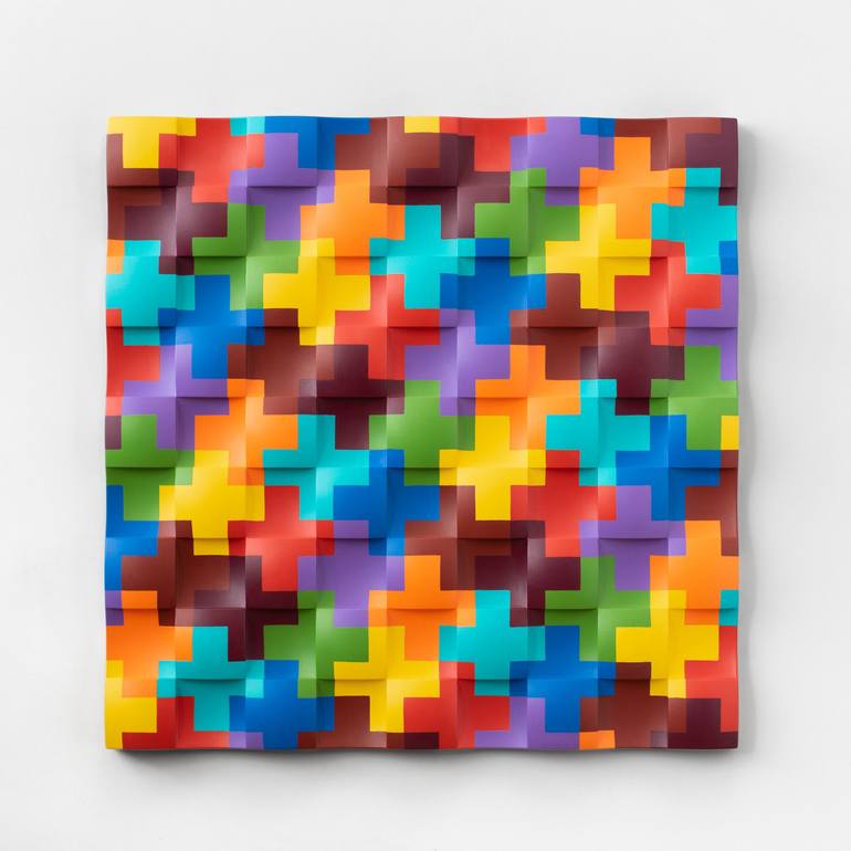 This 3d painting is the sublime transmutation of geometric austerity into chromatic exuberance. An orchestrated a symphony of cruciform elements that transcend mere pattern to achieve a pulsating visual cadence—a rhythmic counterpoint between mathematical precision and sensuous color relationships. ...