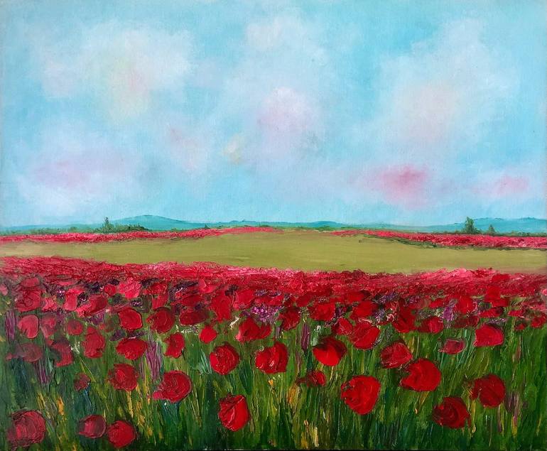 Field of Poppies Original artwork Landscape with red flowers . A painting of landscape depicting a space of otherness.Layers of a collage,drawing media and paint describe multiple landscapes some of these are existing,some from memory and some invented. It contains multiple collaged,drawn and pain...
