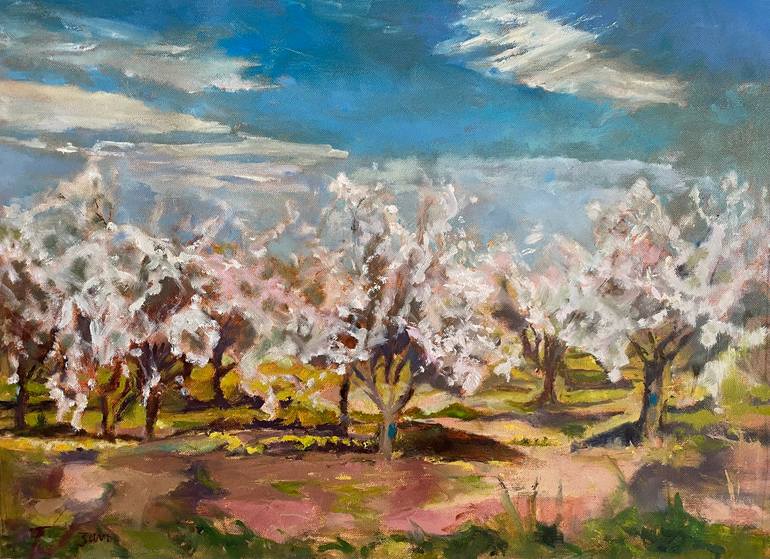 An impressionistic oil painting of pink and white almond blossoms set agains a cerulean summer sky. This work is on unstretched canvas.