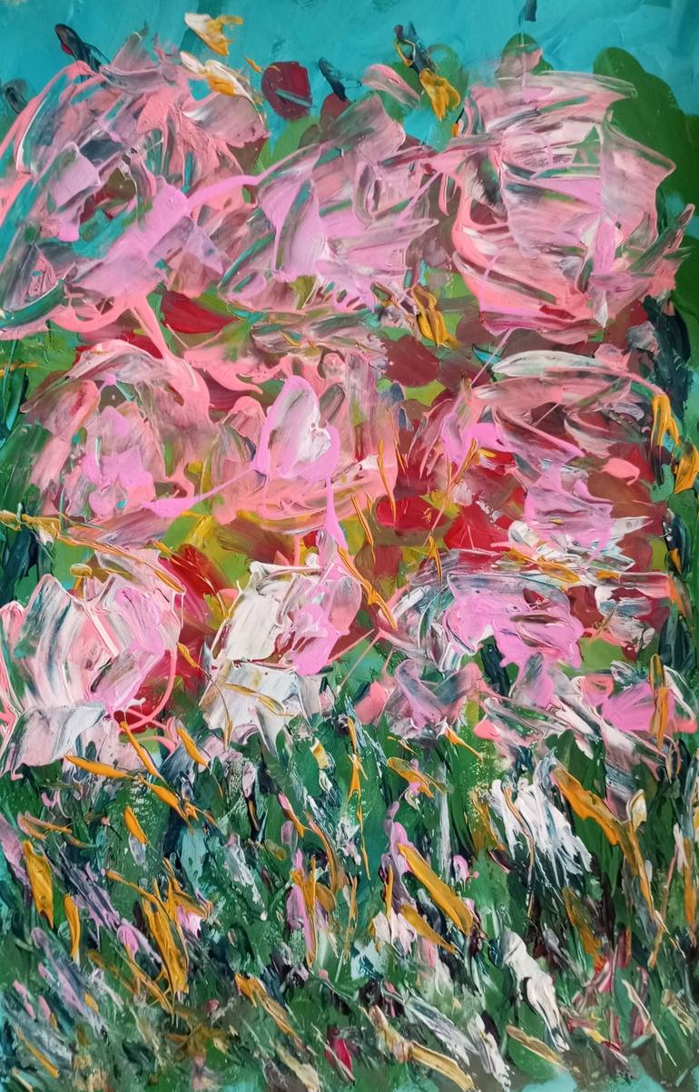 This semi-abstract vibrant expressive artwork celebrates a summer floral period. This floral artwork named "Field of pink roses " with its bright vivid colors represents the ode to life, nature and the beauty of nature during a summer period. This artwork is done with acrylic paints on a professio...