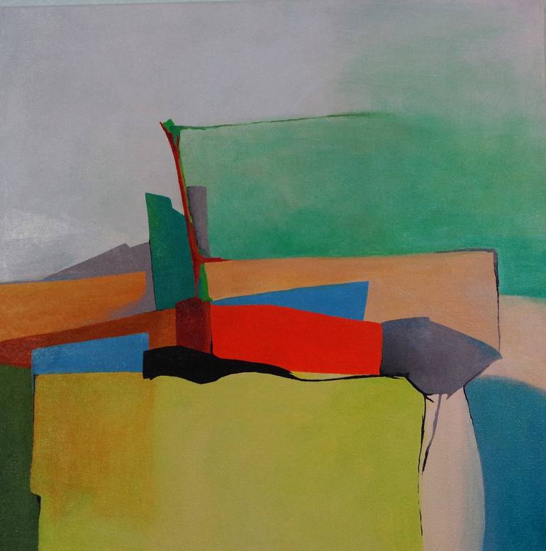 I'm evolving my hard edged geometric paintings to include more organic shapes and a softer color pallet. But ultimately, the slash of orange was what the painting needed. My intent was to create an abstracted landscape of pasture or farm fields and a background of forest.