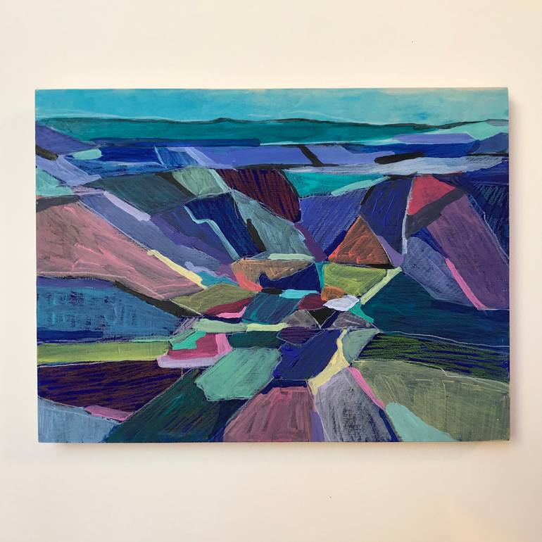 A patchwork of fields inspired by time spent in the Yorkshire Dales. This brightly coloured original work painted on cradled wood is ready to hang on your wall.
