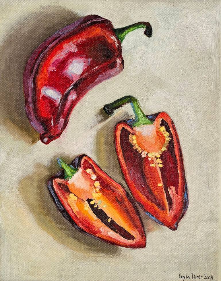 Vibrant Monochrome: This original oil painting captivates with its striking monochromatic red palette. Against the rich crimson backdrop, red paprikas rest elegantly on a matching plate, creating a harmonious symphony of hues. The play of shadows and highlights adds depth, while the intense red tone...