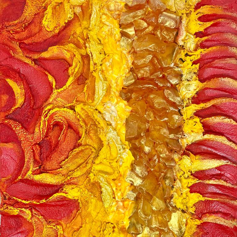 I love looking deep into flowers, examining all the petals and connections. Chrysanthemums have such a complex structure, and the fiery tendrils that sprout near the center, next to the petals are fascinating. This bold and bright painting is made with glass, proprietary texture, and lots of paint...