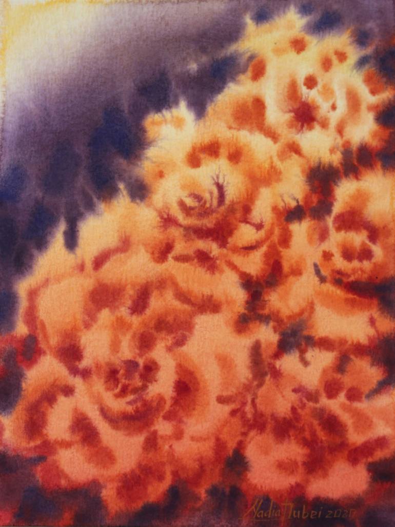 Fire roses are painted in 2020. I drew this picture from a bouquet from my lover. The colors in the picture convey the fire of feelings and love. I hope you will see this flame and get good emotions.