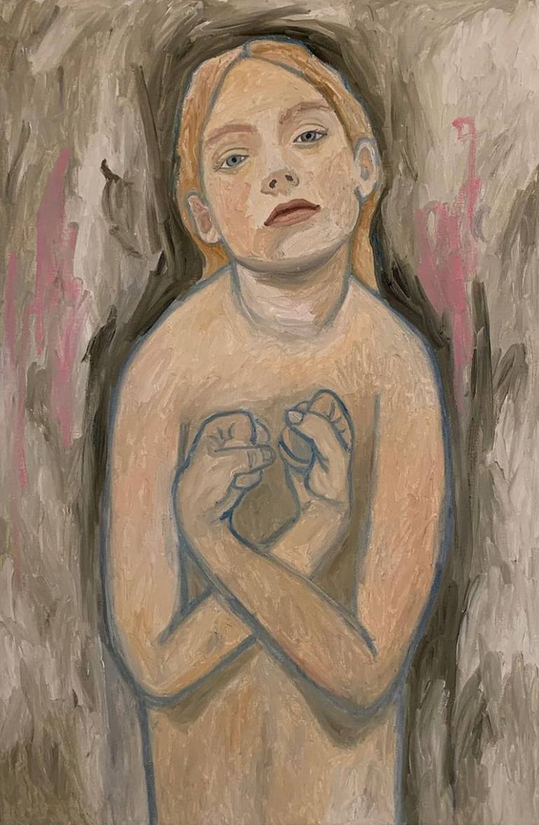 I paint women with clenched fists. There is no strength in the fists, not even in some glances. They are looking for an inner strength, to find their inner voice.They are just at the beginning of their struggel. I call the series "Fighter".