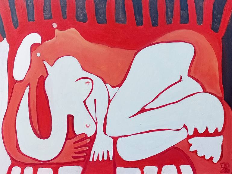 This artwork i named "On the carpet", this is second painting in 2026? a pair to "Red blanket". This artwork is an exploration of intimacy through the lens of geometric deconstruction. Addiction of my red-black drawing drawings from 2024.
