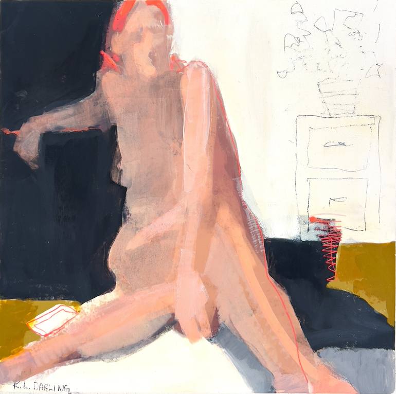 From a series drawn from the life model. I draw digitally from the model weekly then interpret those drawing into paintings in the studio, keeping the work abstracted and bold with the essence of the model. This piece includes collage and line drawing.