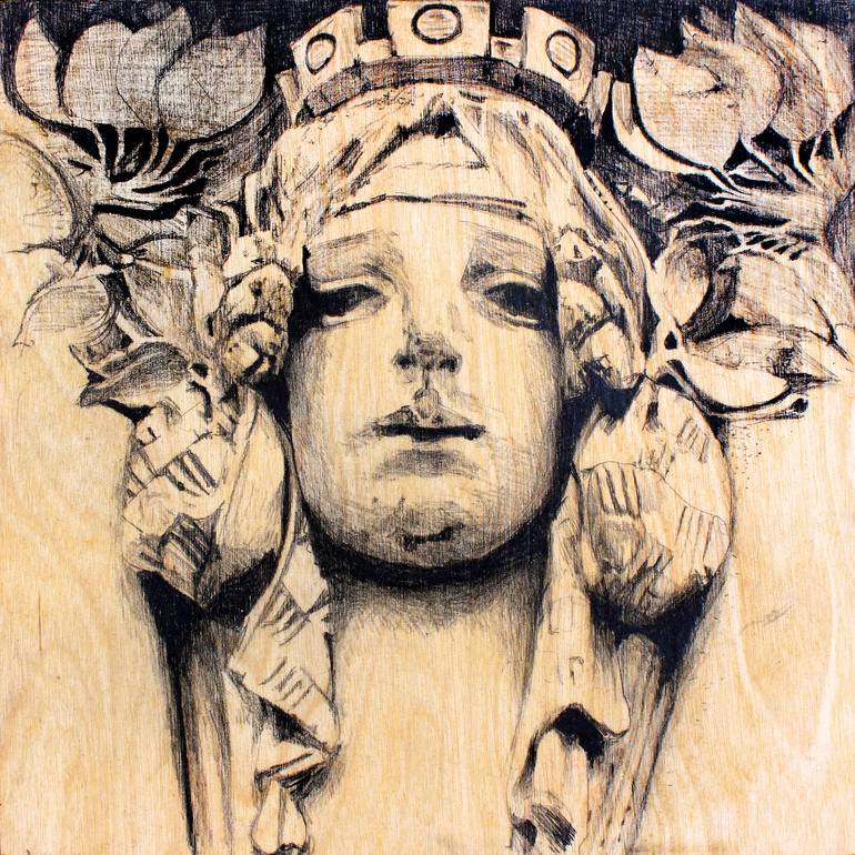 When painting, headdresses and crowns deify Kate Kelton’s subjects. She uplifts the Unsung Sheroes & Heroes, Patriarchy Smashers, Warrior Survivors, Silence Breakers, Philosophers, Truth-Tellers, Whistle Blowers and Thought Giants of all stripes. She paints her portraits cloaked in the garb of statues Ladislav Šaloun sculpted onto the train station that her great-grandfather, Josef Fanta, designed for Prague in 1901 - 1909. Apotheosis through a reclaimed, reapplied Art Nouveau. Sampling her own lineage, she transforms a historical body of work, itself a thing of lasting beauty; exchanging granite for graphite, plaster for paint. In Photoshop, she first combines the desaturated faces she's found, sourced or shot of her chosen subjects, with the black and white photos from her family and friends, of the statues in situ. Then she uses graphite, inks and acrylic paints and glazes to create the works on panel or canvas, literally uplifting and elevating her battle-weary subjects to the highest reach of architectural strata. 'Ancient and distant godlike beings, surveying a dying empire, trade places with the fresh blood of her subjects. The work presents a tactility against the digitized space, and represents a taking, an acquisition of power back from the tastemakers. Here, the mantle of the artist is above brand influencer, above internet commentator, above mere marketability. In their gaze is a warning, “Art is immortal. Come for me, why don’t you?”' ~ Micah Chaim Thomas "Kate's recent work is a matter of expansion through contrast - she is as ephemeral as her subjects are concrete architecture; she is structural when her subjects should slip through your fingers like too-fine sand. Taken as a whole, the works in her magnificent series Sentry are incredibly intelligent, but when looked at individually, you come to understand that these are statements of life beyond themselves. The series take embellishments of a Prague train station designed by her great-grandfather, Josef Fanta, and combines these with portraits of women who have stood against the sexual harassment and assault rampant in Hollywood. These women, like Kate herself, have suffered in the era where powerful men, every bit as immovable as the train station, wielded their power without check. The portraits emblazoned on architectural elements, they are marked against the edifice, every bit as permanent, and perhaps even more defining.