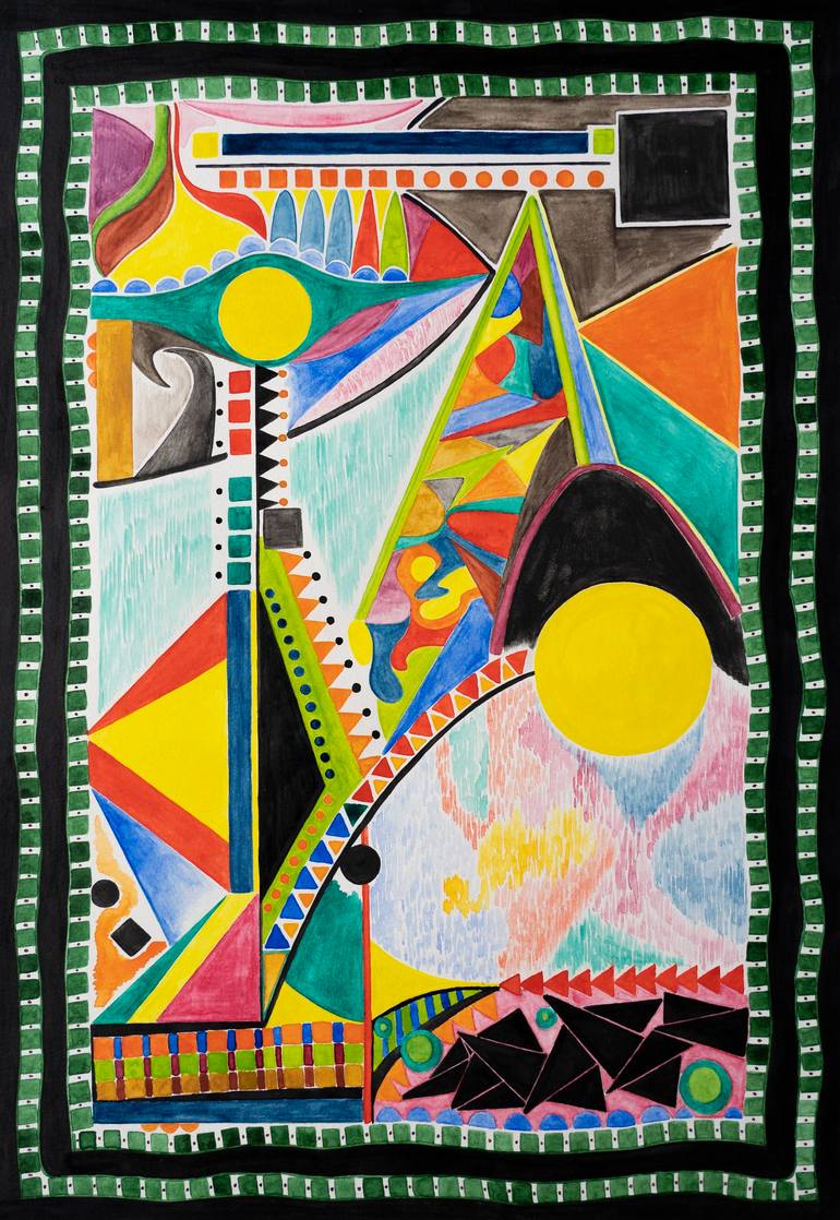 The lower right corner of the work is a fish, and the teeth are dyed green because of the seaweed. The triangular color block and dots in the lower left corner are a sailboat. A fishing net is sprinkled. The upper left corner is also a fish. There is a seed that can grow seaweed. The black square an...