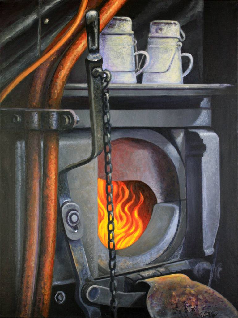 Fire Box on Steam Train Severn Valley Railway 50th A red hot steam train firebox burns with red copper pipes and hot tea mugs keeping steaming warm ! :) My series of Severn Valley Railway Oil and Acycric paintings for the 50th year 2015 celebrations of opening to the public. This scene was captured ...