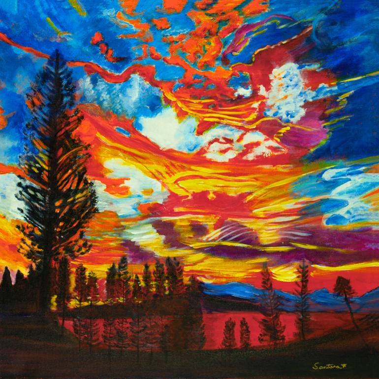 This painting was inspired by a sunset from the lanai Kapalua, Maui. The trees and land were black Silouettes. There were many vibrant colors in the sky, the ocean was red. The bright colors of Acrylic paint work with this painting. I hope viewers will enjoy the vibrant, beauty, movement, yet underl...