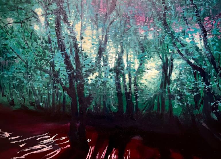 This painting is inspired by parts of the woodland where I live in the UK. There are many sinuous Hornbeam trees which live along the edges of paths and bordering fields. These trees have a very fluid quality, like dancers. I wanted to look at their fluidity of form as an overlaying structure to the...