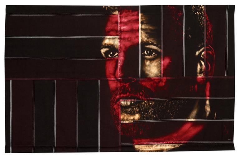 2015 Original Bleaching technique and dye on textile made from vintage flags Flag size 1140 x 730 mm Framed Size 1245 x 835mm Framed with bespoke black box frame, with white behind flag and white fillet. The portrait is based on the Rugby player James Haskell.