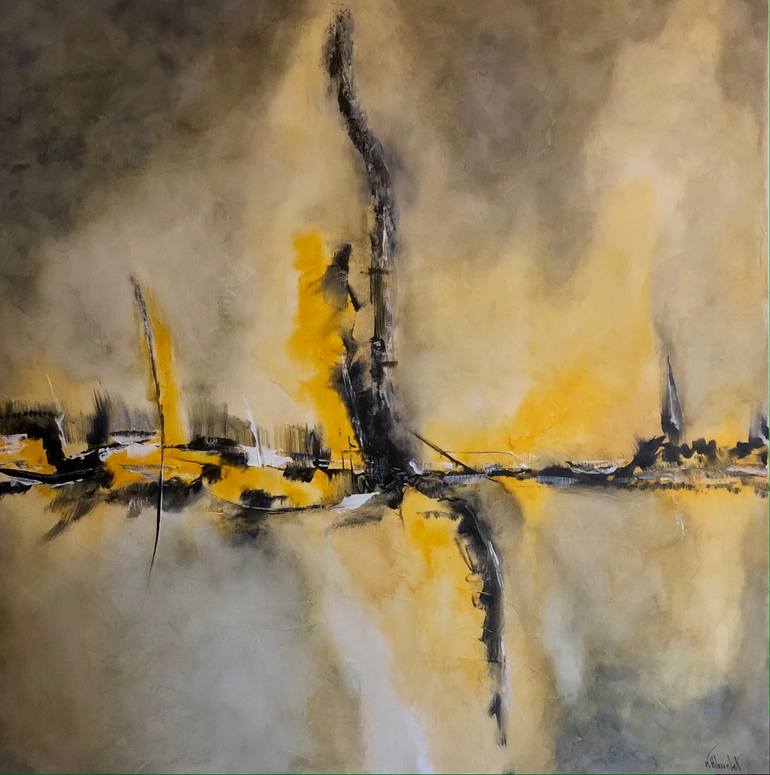 Canvas on frame from the yellow series. Imagnary fire representing a line that lets you go towards a universe that only you can create. It does not show a specific fire, it is based on the dynamics of colors and these horizontal and vertical lins and matter.