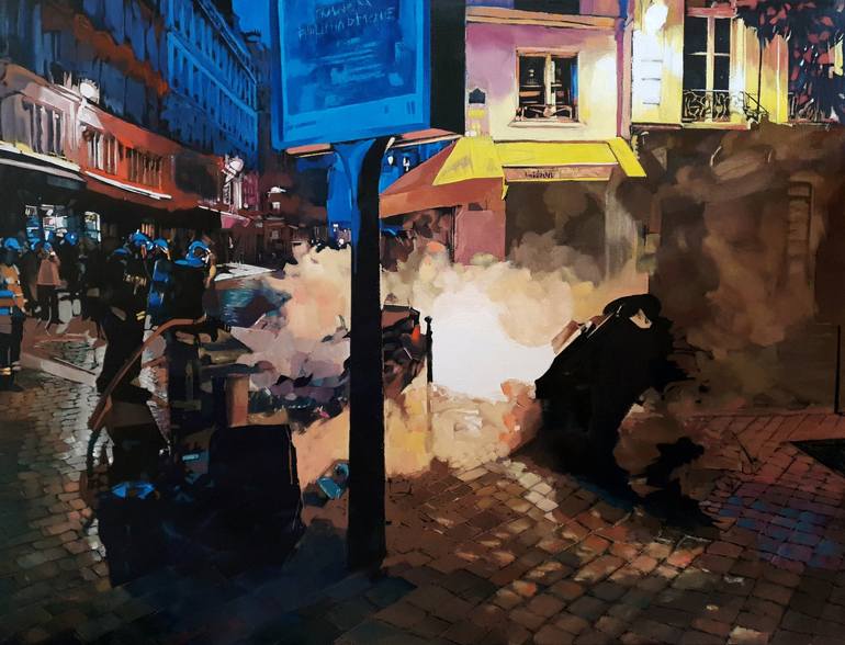 Relating the manifestations in France in 2018. Trash fire at night at "rue Saint-Martin" (Paris) A quite divided in 2 composition joined by a kind of imaginary fire divinity ... People late at night looking at the firemen. Typical "Hausmann" buildings, smoke and unreal lights, central and blinding f...