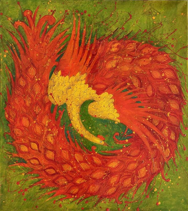 This stunning original piece titled "Firebird" was created by contemporary Russian artist Vyacheslav Gayun in 2024 and is available for purchase online. The painting features a powerful and majestic phoenix enveloped in a swirling blaze. Its body is adorned with vibrant orange and red feathers that...