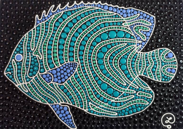 Original acrylic painting on wooden panel (plywood), not framed. Title: Fish 3 Size: 30*21 cm A4 / 12*8 in Medium: acrylic Technique: dot art This miniature artwork features a stunning blue fish, intricately created using the dot art technique. The vibrant blues and greens bring this sea animal ...