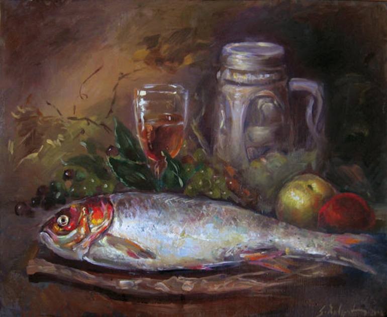 Still Life with Fish, Fruit and Wine. Painted in 2001, Tbilisi, Georgia