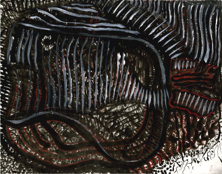 Ink, watercolor, and acrylic on paper. The piece is 14x11 inches, created in 2005 by Yael Degany. Colors: Black, Red, White. Some says it looks like a fish; some say it looks like outer space. It was painted to music in a fluid way and felt like dictation.