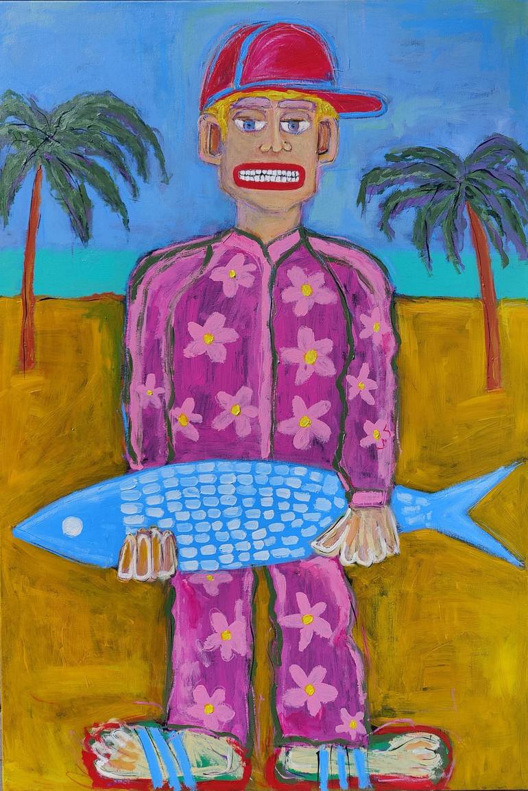 The painting evokes a profound emotional tension that saturates every inch of the canvas. The man in pink attire stands on the beach, his facial expression ambiguous, yet possibly reflecting alienation and uncertainty. His hands grasp a fish, symbolizing not only his inner turmoil but also a sense o...