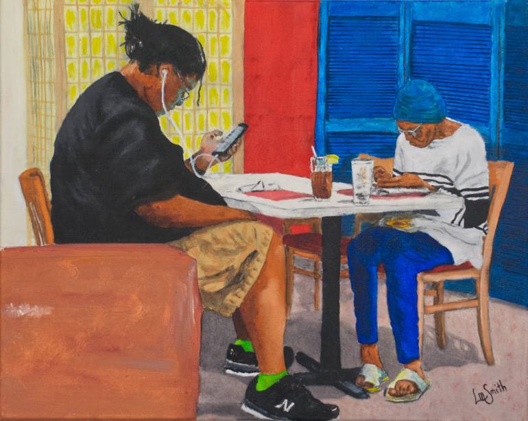 My father worked for Burroughs Corp. from 1949 until he retired. The result was I almost as nomadic as if I was a military brat. Being a frequent “outsider” made me independent and a loner. Around age 7, having thoroughly explored the medium of finger painting and crayons I found Jon Gnagy on TV and learned to draw. My folks even bought me a Jon Gnagy Learn to Draw set which became my first offical Art tools. I began oil painting at age 12 when I took a night class at a community center with a bunch of “old ladies” (probably in their 30’s) who doted on me. Without realizing it I found my life long obsession. After high school in 1969 I went in the military. After discharge I moved to Los Angeles. I went to college on the GI Bill in the 1970s when the state had a great, affordable college system and graduated CSUN with a BA, art major, anthropology minor. Knowing I liked to eat I focused my talents toward Commercial art moving from production to graphic design to illustration to photography to large format digital printing, etc. As I became deeper involved in this career I put my paint brushes away to concentrate on my work in commercial art. After a long and winding road which included moving from Los Angeles to Shreveport, La. to Prescott, Az. and back to Los Angeles and many hats along the way I declared myself retired officially. I turned around and found my easel still standing there giving me the stink eye for having been ignored for the past 40 years and I began again to court my obsession of oil painting. I am mainly a Figurative painter. I always loved the Dutch painters even though I thought they were a little over romantic and dramatic. I also love bright colors. What you see is the result of all that. My interest in Anthropology fed my interest in painting people as themselves, to themselves. I also enjoy a little abstract work on occasion and find it a great pallet cleanser for me to move on from a painting I became involved with.