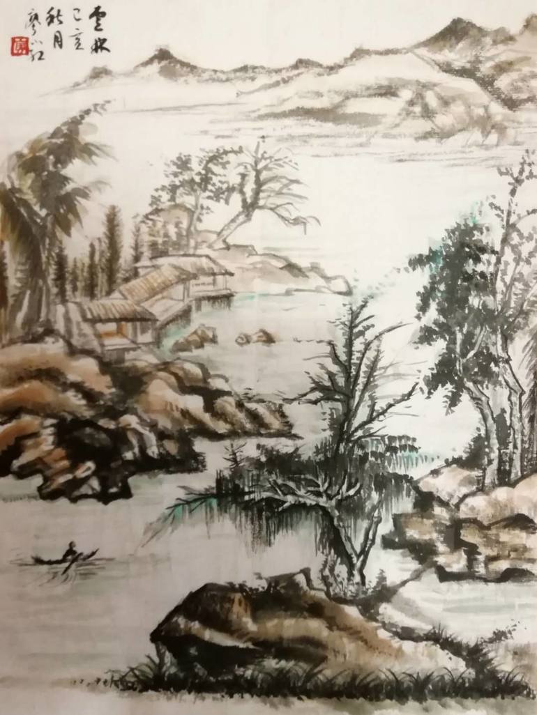This beautiful piece of art is created by artist Ms. Liao in 2019. She just left home country China and moved to Canada. It's painted out of homesick emotions and inspired by the greatest poetry of Du Fu: . "The creation of nature is dark and light, river dusk and dawn..."