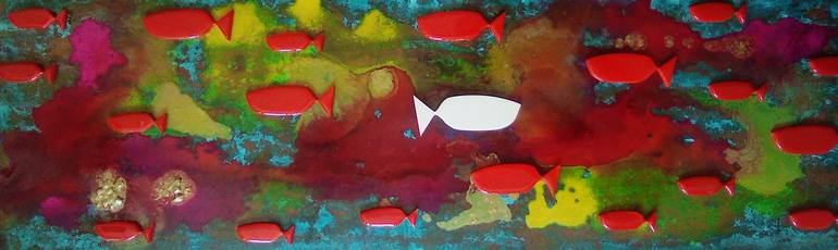 lavoro realizzato su base di rame anticato con metodi naturali, sagome in resime epossitica.aggiunta di colori acrilici