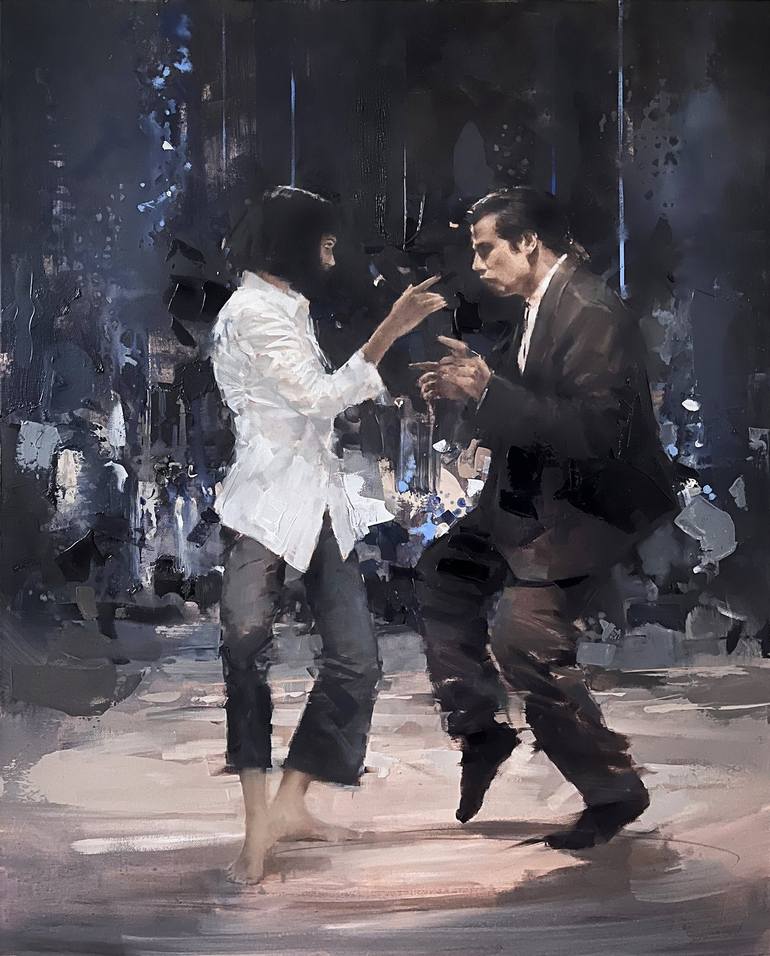 Using French blue, burnt umber and titanium white to describe this icon movie scene. The background was deliberately abstracted to suggest something yet at the same time nothing too much to distract from the two figures.
