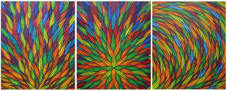 Modern paintings : Flamboyant colors movements. Works made in Posca (Uni) on canvas-covered wooden frames (quality chassis). Frame edges painted in black acrylic. (Gradations of colors done with the finger). Protection : works spray painted with mat spray. Materials used : Posca / Acrylic / Varni...