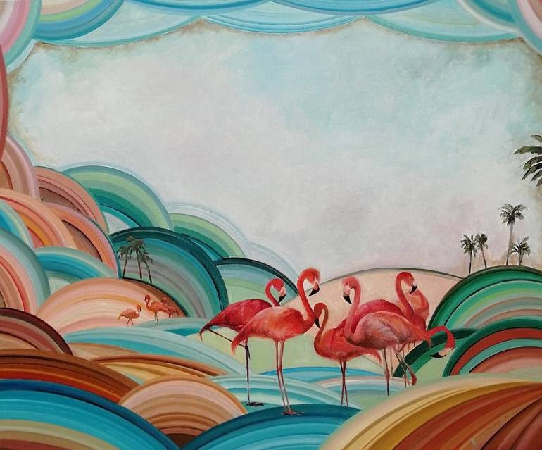 Details: Name: "Flamingo beach" from My Art for Kids Collection * Artist: Radosveta Zhelyazkova * Medium: Professional oil paint, UV protected varnish on canvas * Size: 60 x 73 x 2 cm * Style: Naive Art, Radism, Futurism * 100 % handmade artwork * Date of creation: December 2020 * Comes with a certi...