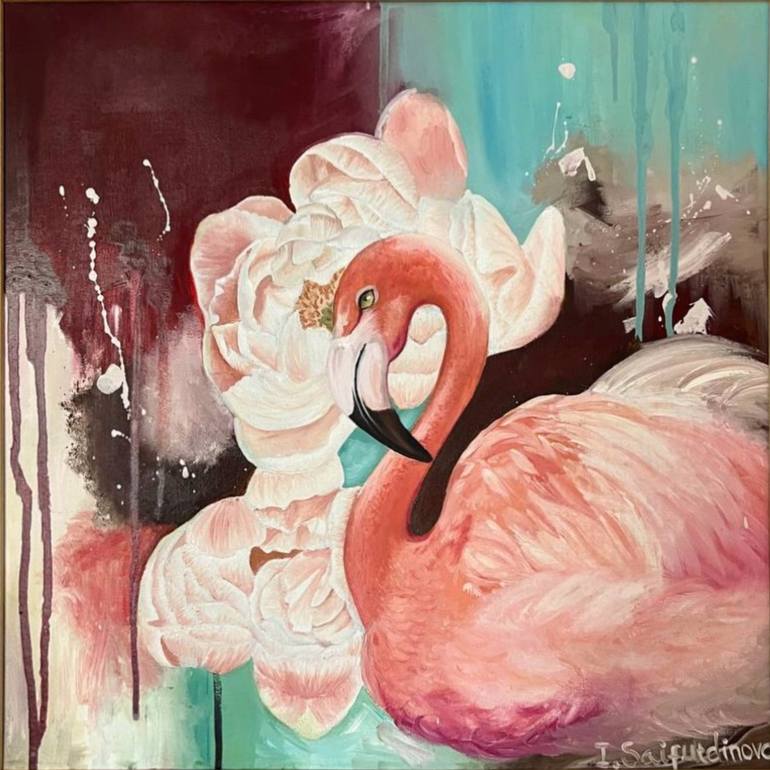 This painting by nature of Kazakhstan, Lake Tengiz , where flamingos live in spring and autumn. For 50 years, the reservoir has been transformed into a land with a rich food supply and therefore has become a stopover for a number of birds, including pink flamingos, on the way of flights.