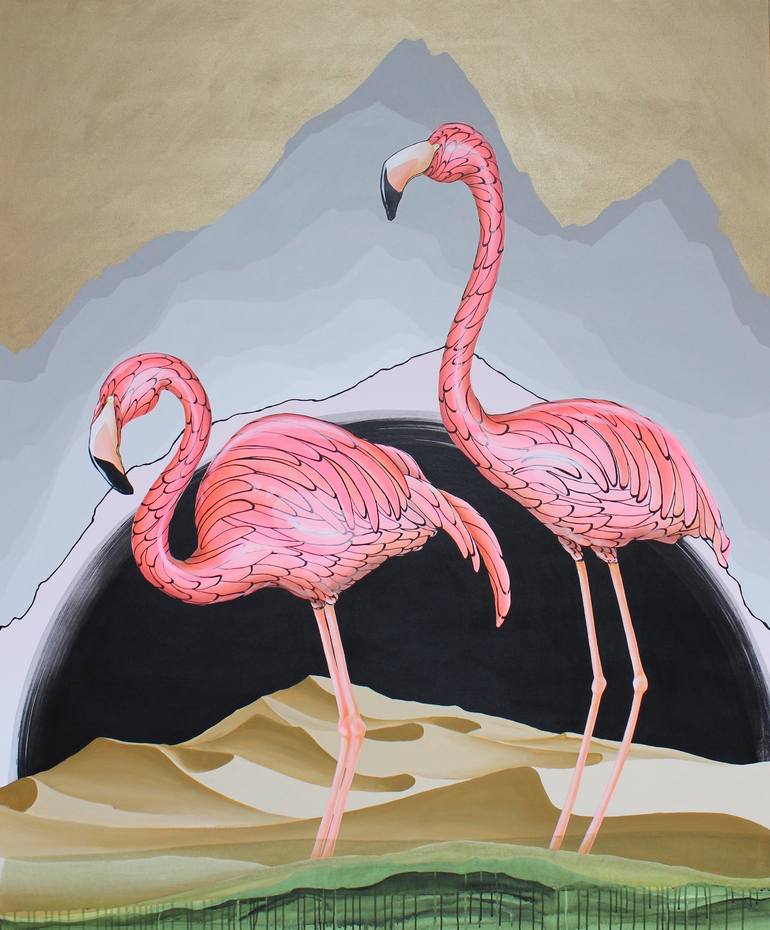 Flamingos have long been seen as a decorative addition to lawns and pools. I do a lot of research on animals and their natural habitats when thinking about subject matter that deals with climate change. I was surprised to find that flamingos are found in desert regions as well as in the tropics.