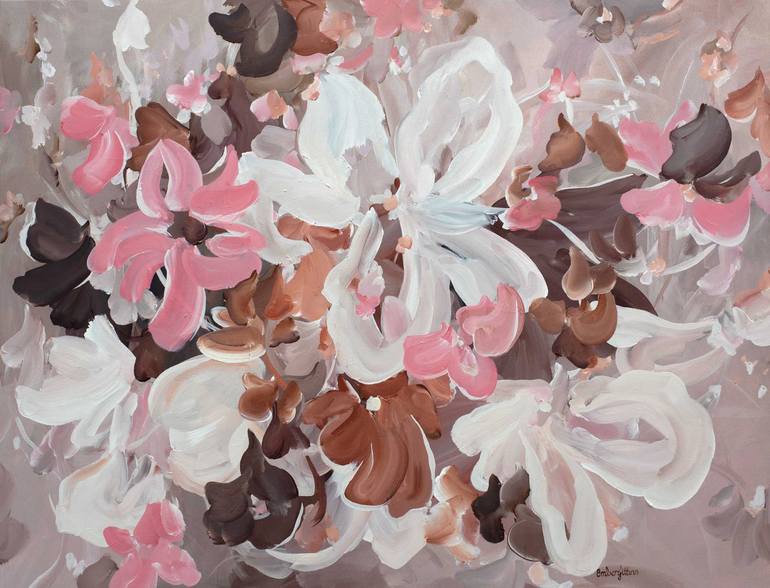 A gorgeous colourful flower inspired piece of original art that showcases the wonderful blooms and colours of flowers within our gardens. This stunning floral abstract original painting will elevate your room with a modern organic style and soft and romantic colour palette of soft pinks and warm bro...