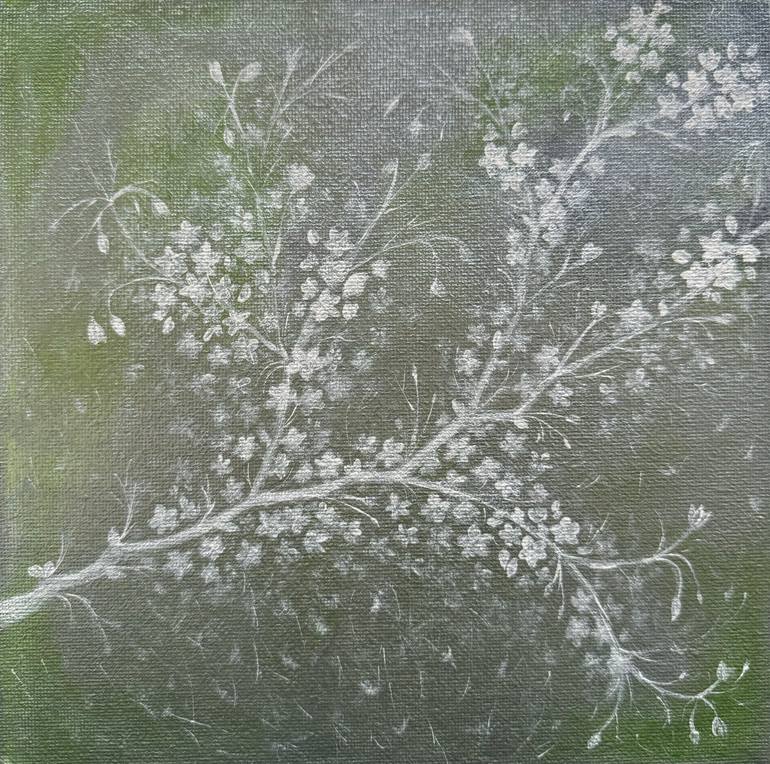 «Pearlescent Flower» is painted on the canvas panel and can be placed in different types of frames. White-pearl flowers on a green-silver background create a stunning contrast, blending tranquility with modern elegance. This serene palette exudes timeless beauty and freshness, perfect for a refine...