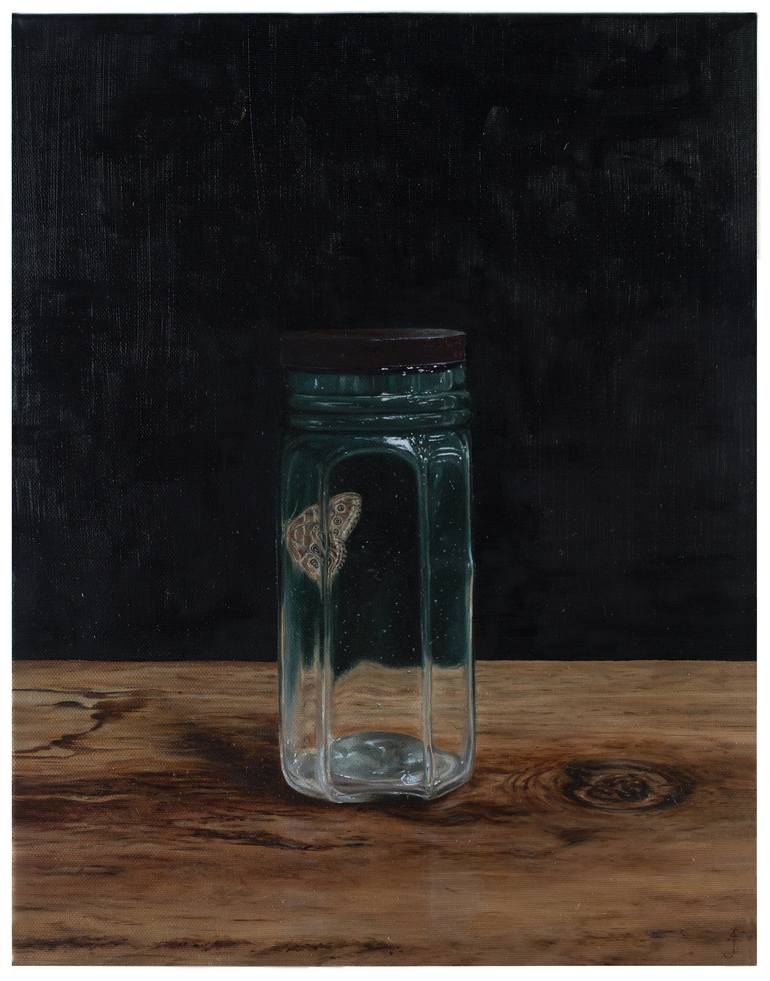 Inspired by the historical genre of still life painting, I wanted to depict an elegant yet simple form to really focus on detailing and lighting. In some cultures butterflies are considered to be spiritual messengers. Here, the Blue Morpho butterfly is confined to the space of the jar, the spiritual...