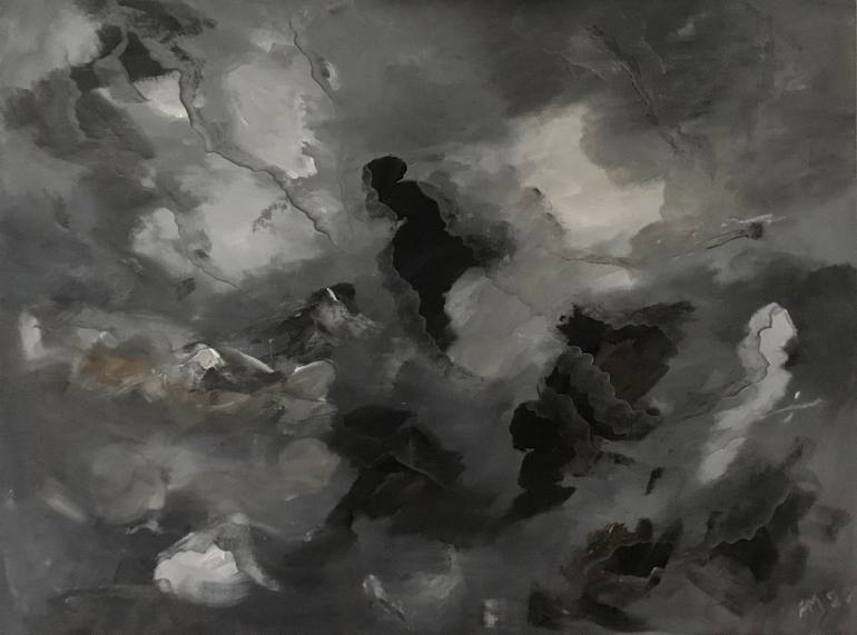 This is an acrylic painting on canvas in grey and white, inspired by the heavy and dangerous motions in the world.