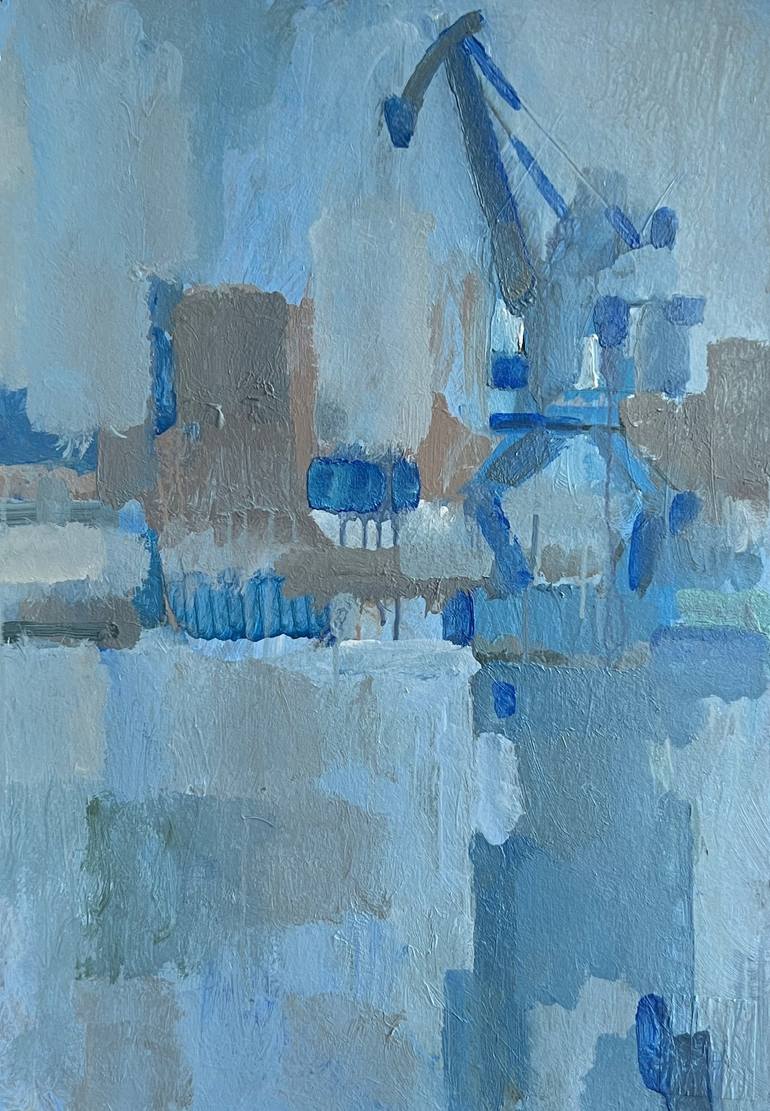 Floating crane on the river as a symbol of urbanism. Strict painting in close tones.