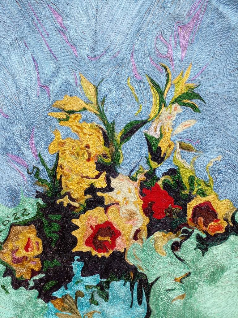 Floral Effusion’ boasts simple pleasures- a pond setting of flowers replete with vivid hues and freshness against the backdrop of a bright blue sky. I caught sight of a bouquet in a vase and was inspired to make this thread painting.