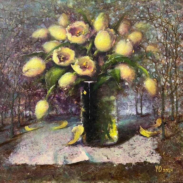 Dark Purple Yellow Ethereal Bloom Spring Wall Art – Textured Oil Painting in Earthy Tones, Tulip Bouquet Flower Vase, Moody Passionate Floral Still Life, Large Wall Art in Muted Violet Retro Vintage Style This painting is a magical blend of Floral still life, creating the feeling of a dream or memo...