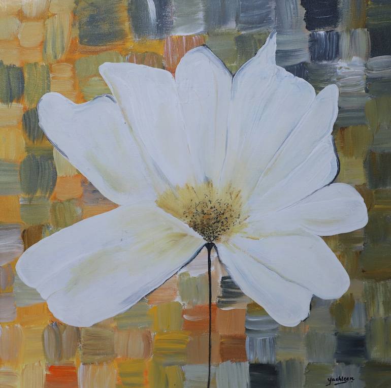 A white flower painted on an abstract background of yellow and grey hues, this piece is a projection of serenity and and a classical elegance.