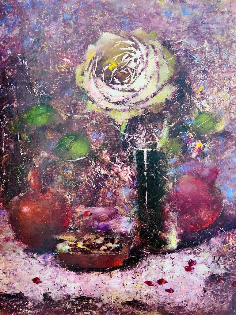 This romantic floral still-life painting captures the elegance of a rose in a vase and the rich symbolism of pomegranates, set against a dramatic dark background. The composition, bathed in royal purple, deep red, and burgundy tones, creates a mesmerizing contrast with the bright reflections, maki...
