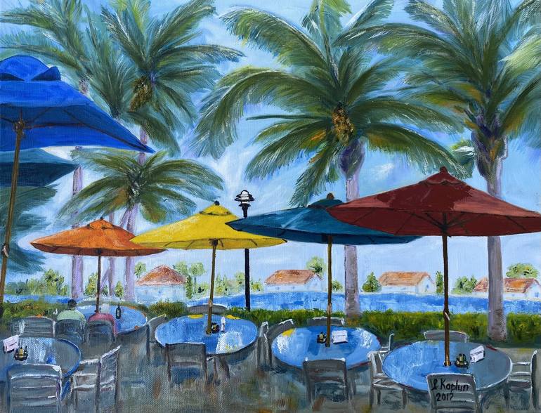 Cafe, Umbrellas, Painting, Palm Trees, Cityscape original oil painting on stretched canvas. Beautiful cozy water view cafe in some Florida City. Old palm trees and bright umbrellas create a special atmosphere. The cafe is ready to receive more visitors, but so far only one couple enjoys a beautiful ...