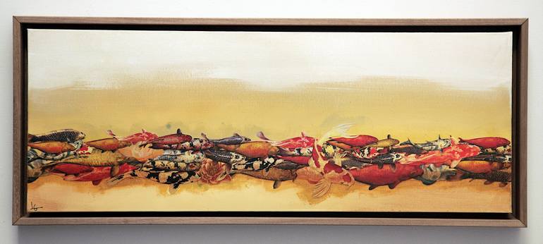 A delicate flow of beautiful Koi fish. In Japan, Koi fish are traditionally symbolic of prosperity and good fortune. Set to a background of yellow ochre and off-white with the slightest hint of pale blue. Warmth is added from washes of burnt sienna and nut brown inks. A varnish finish adds texture a...