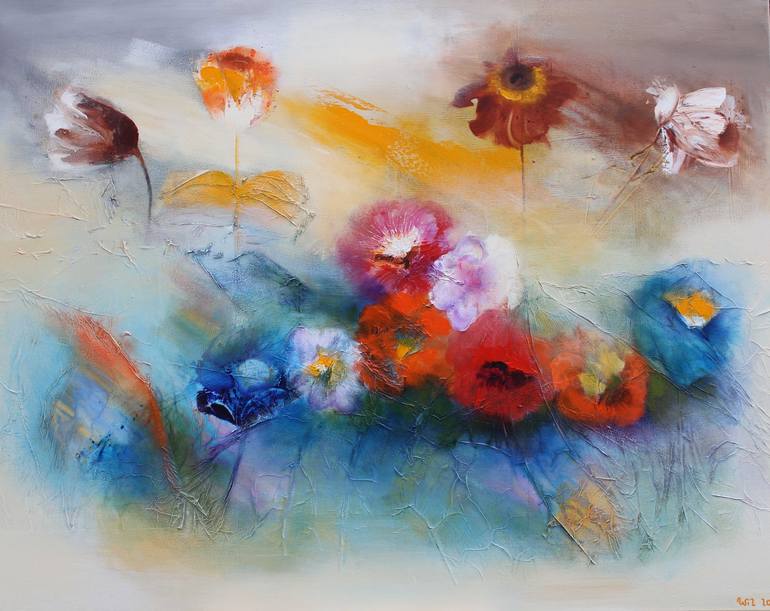 Wil Lof – About Me and My Education Wil Lof joined a major Dutch textile printer as an apprentice designer. She continued her background in industrial applied art for about twenty years as leading designer and colourist of fashion motives, which were produced by several textile printing companies in eastern Netherlands and cross border in western Germany. Her designs found their way to Europe, Africa, Middle East and South America in the form of printed fabric for clothing. Her first exhibition of paintings attracted a lot of attention and she received rave reviews from the regional press. In addition she found in the 70’s time to study at the Academy of Art and Industry (Enschede, the Netherlands), specializing in graphic and textile design. Now. Wil Lof is a well-known Dutch painter active in both her home country as well as throughout the Mediterranean, and creating her paintings both in her own ateliers in the Netherlands as well as France. Apart from one-off original paintings, selected works are reproduced as limited edition giclée’s or even individually upgraded as mixed media canvasses. Wil Lof – Style of her Artworks Wil Lof emphasizes on decorative, abstract-styled paintings with dynamic, powerful colours, realized in mixed techniques. Applying a special bonding technique, she covers the canvas with carefully selected rag paper, which – while drying – tends to wrinkle. The resulted pattern is observed, and if possible, used to accentuate the motive to be painted. For the mainstream of her work she uses top brand acrylics, with a favour for strong and intense pigments. Wil applies the paint in very thin layers, using her hands, brushes, sponges, and palette knifes. The result is a dynamic painting of which the colour balance changes under the available light, warm in the morning light; bright under full sunshine, warm and tender at sunset. Artificial light of variable strength can be used for highlighting. The 'colour coded' compositions of her works carry the spectator away into speculative or interpretative imaginations of the painting. Many observers characterize her paintings as being esoteric, anthroposophical, or even ‘elysian’. Apart from her series of pure abstract and figurative paintings, emphasis is now in combining both styles into mysterious scenes.