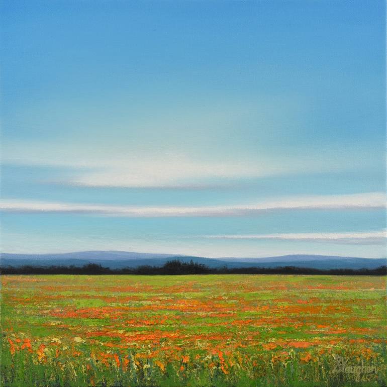 Flower Field is a modern minimal landscape oil painting from the Blue Sky Series. Featuring an atmospheric sky with soft fluffy clouds above distant hills and a lush green field with vibrant orange flowers. Inspired by wide open spaces it captures the fresh energy and vitality of a Summer day in the...